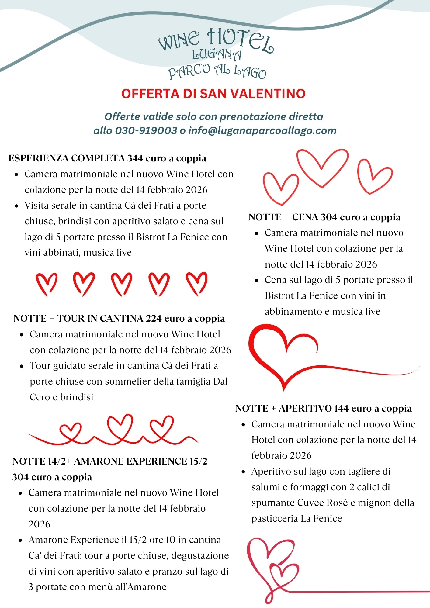 Per gli ospiti che vengono da lontano, consigliamo l’hotel Lugana Parco al Lago & Wine Hotel allo stesso indirizzo del ristorante (via Verona 69/71 Lugana di Sirmione BS) per il pernottamento, con camere romantiche anche vista lago. Per info sull’offerta romantica di San Valentino: +39 030 919003 o info@luganaparcoallago.com