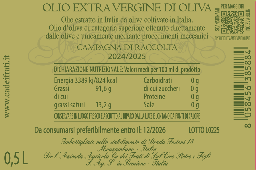 Per preservarne la massima qualità, utilizziamo bottiglie completamente smaltate per schermarlo dalla luce e ridurre i perossidi. L’attenzione dedicata a ogni fase del processo a filiera completamente inertizzata ci permettono di offrire un olio di eccellente qualità, in cui ogni goccia racconta la nostra storia e dedizione alla tradizione olivicola.