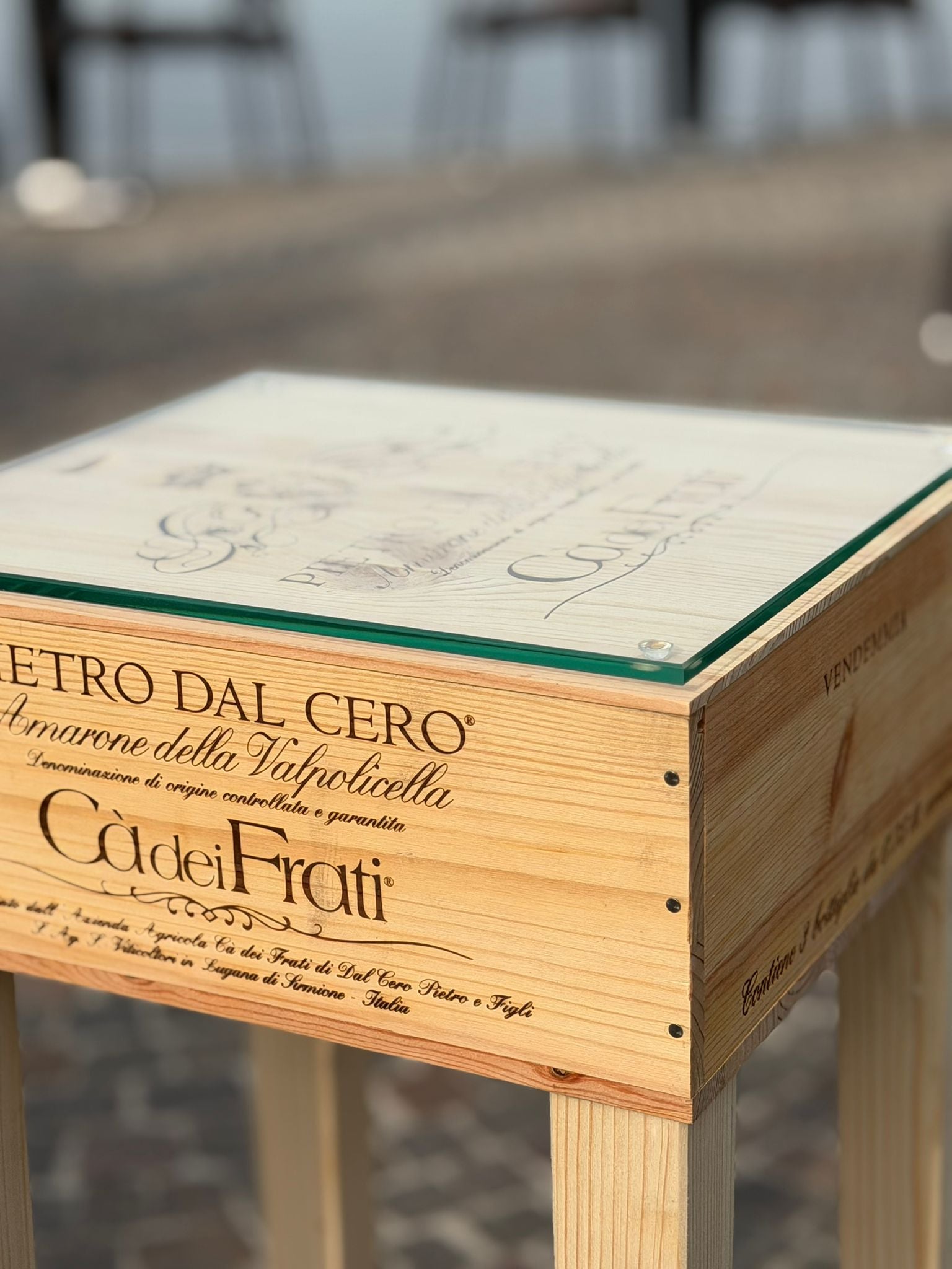 La struttura è composta da quattro solide gambe in legno naturale che sostengono una cassa di legno incisa con il marchio Cà dei Frati. Il piano superiore in vetro tagliato a sagoma protegge la superficie e rende il tavolino pratico e raffinato, ideale per appoggiare bottiglie, calici o accessori da degustazione.