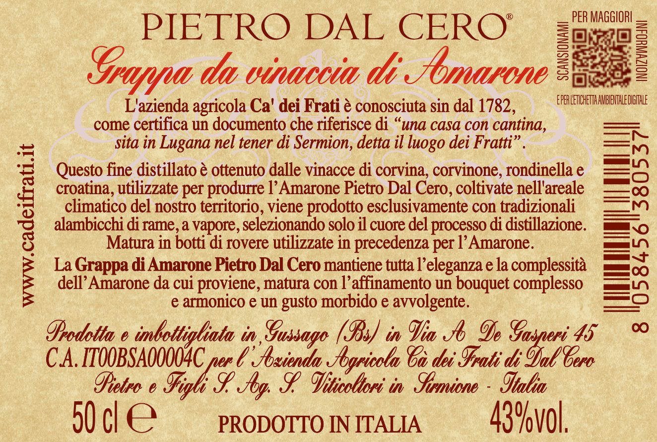 Spirito, essenza, frutto della distillazione, questa grappa nasce da nobili vinacce morbide dell’uva ricca che ha dato vita all’Amarone, da cui prende l’armonia degli aromi e la suadenza del gusto. Morbida, avvolgente, elegante e fine con note di miele di castagno, di prugna secca e liquirizia, frutto di una distillazione attenta e scrupolosa. Dal sapore pieno e deciso come l’uva della terra di Valpolicella che porta nel distillato le caratteristiche uniche di morbidezza, eleganza, ricchezza e la concentrazione dell’appassimento sui graticci. Un metodo di distillazione che viene dal passaggio lento, a bassa temperatura con alambicchi in rame, capace di trasmettere nel bicchiere ciò che con fatica abbiamo ottenuto in vigna.