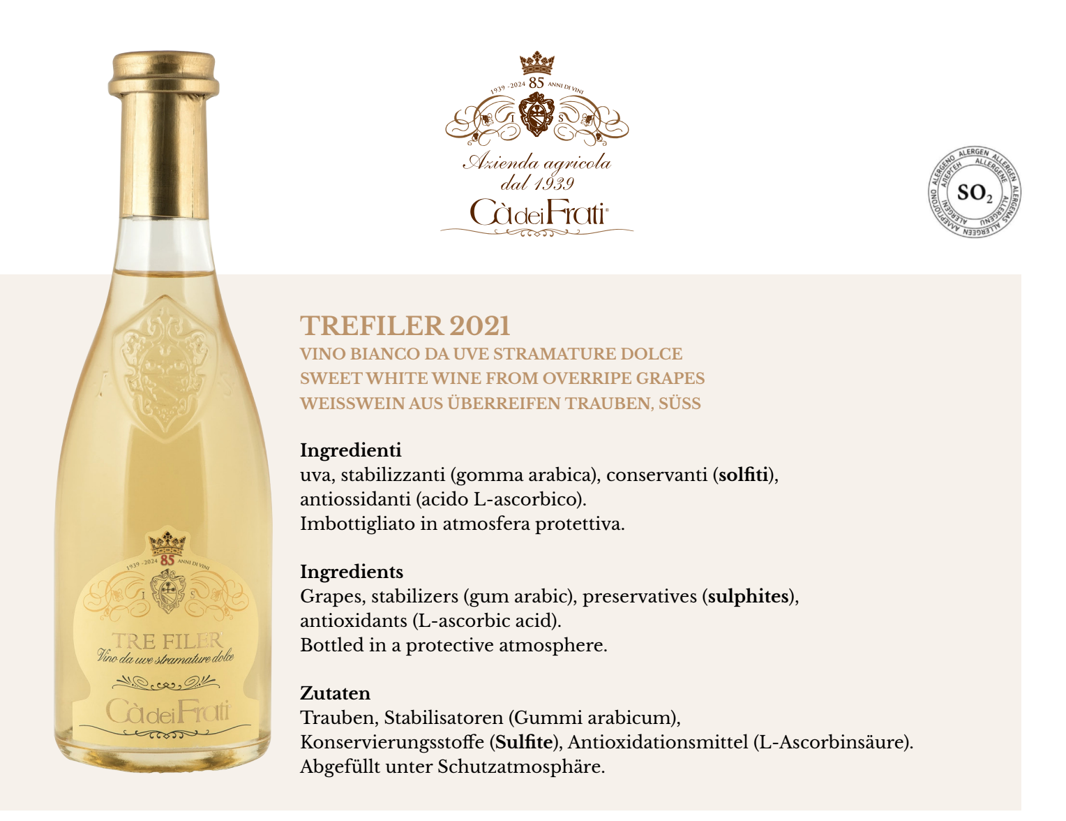 La grandezza di un vino dolce si misura dalla sua capacità di rimanere in equilibrio tra dolcezza, acidità e sapidità. Il Tre Filer riesce a riassumere tutto ciò con sensazioni inaspettate. Un vino accogliente, fragrante con note di frutta secca e miele; è suadente ed emozionale e porta con sè tutto il sole dell’autunno. In bocca l’attacco è avvolgente, ma è proprio l’acidità a renderlo esclusivo.